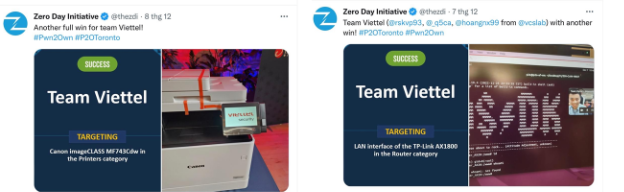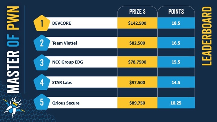 Today, we are proud to announce that our Viettel Team with 9 researchers, Ngo Anh Huy, Nguyen Phuong Nam, Le Tran Hai Tung, Ha Anh Hoang, Nguyen Xuan Hoang, Doan Phan Tung Duong, Nguyen Dinh Bien, Ha Van Toan, Pham Van Khanh and more, have been successfully Pwned to 9 targets included SOHO SMASHUP. They have succeeded 9/9 attempts, got $82,500, 16.5 MoP points for team and got ranked 2nd Master of Pwn.