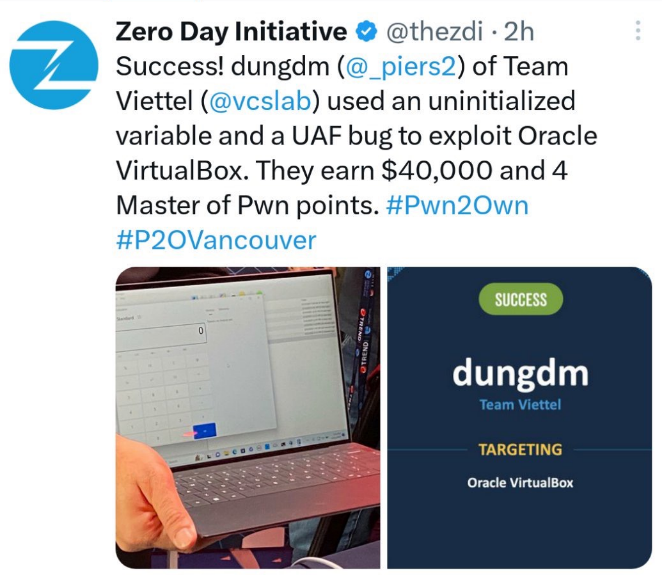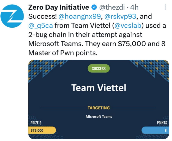 Today, we are proud to announce that our Viettel Team with 4 researchers, Nguyen Xuan Hoang, Doan Phan Tung Duong, Do Manh Dung, Pham Van Khanh, have been successfully Pwned to the targets Microsoft Teams and Oracle VirtualBox. They have succeeded 2/2 attempts, got $115,000, 12 MoP points for team and got ranked 3nd Master of Pwn.
