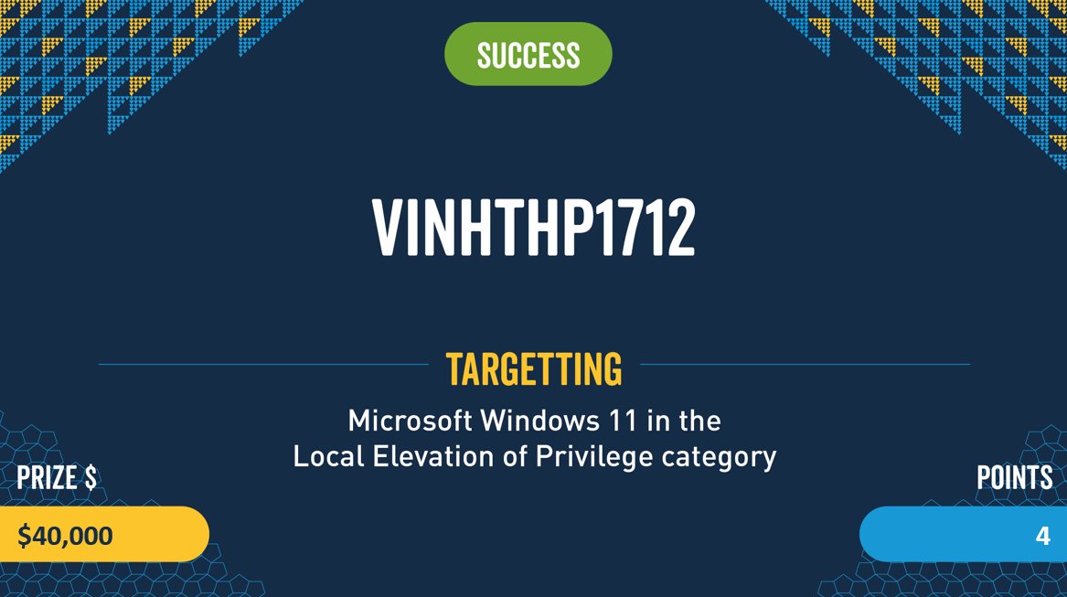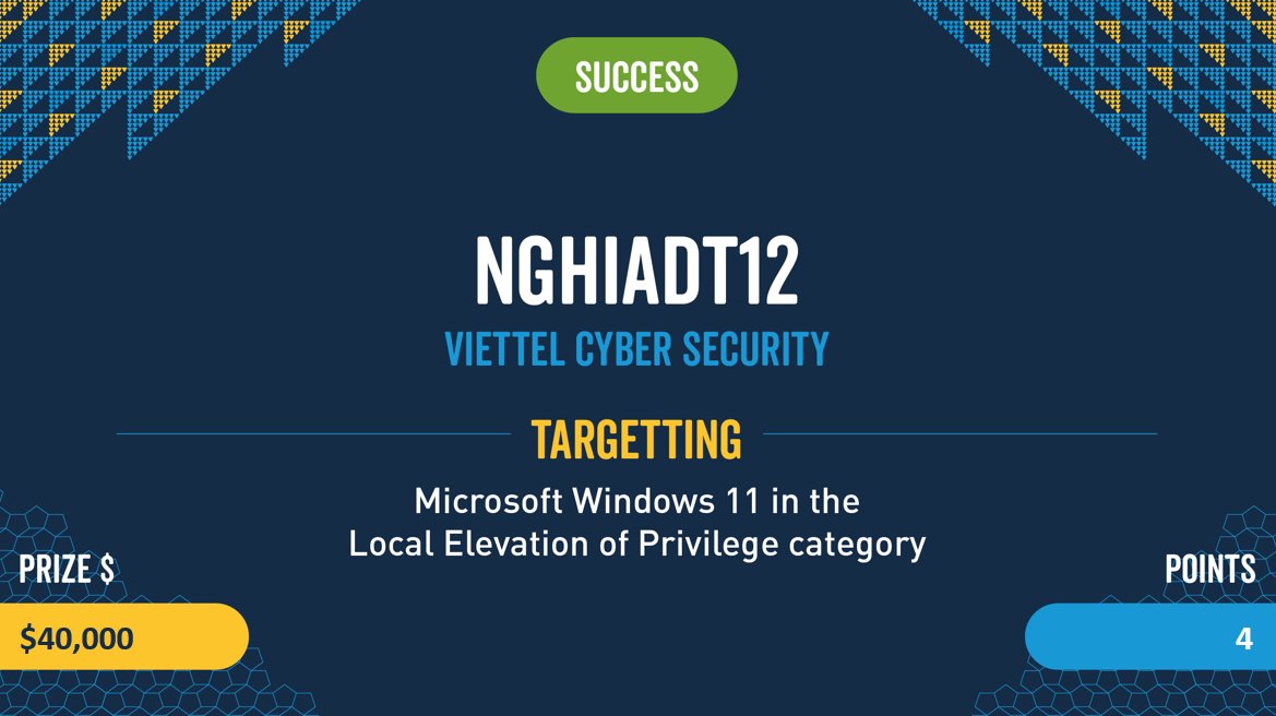 Today, we are proud to announce that our Viettel Team with two researchers, Dao Trong Nghia and Tran Huu Phuc Vinh, have been successfully Pwned to the target Windows 11 in the Local Escalation. They have succeeded 2/3 attempts, got $80,000 and 4 MoP points for team.